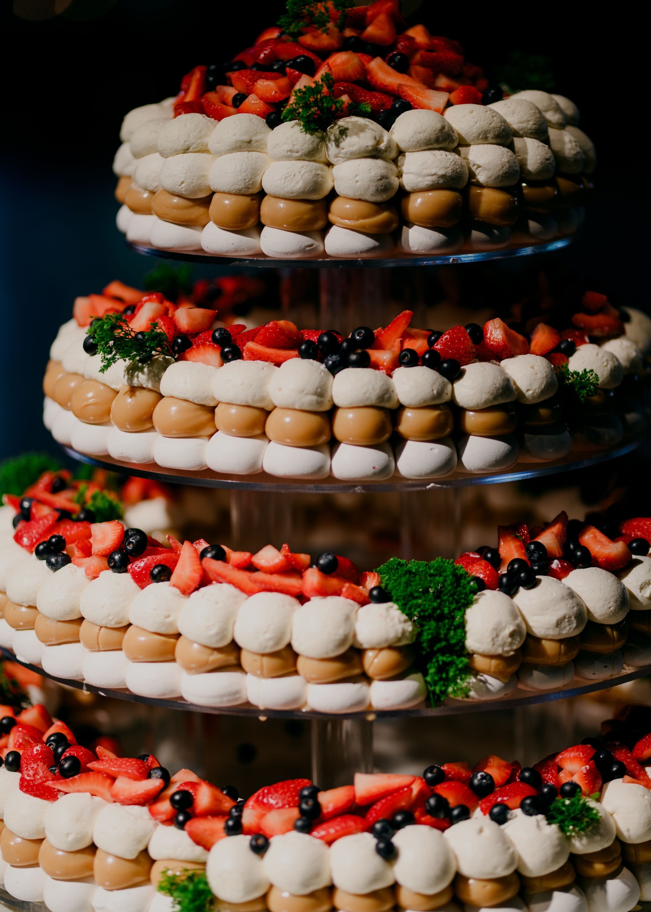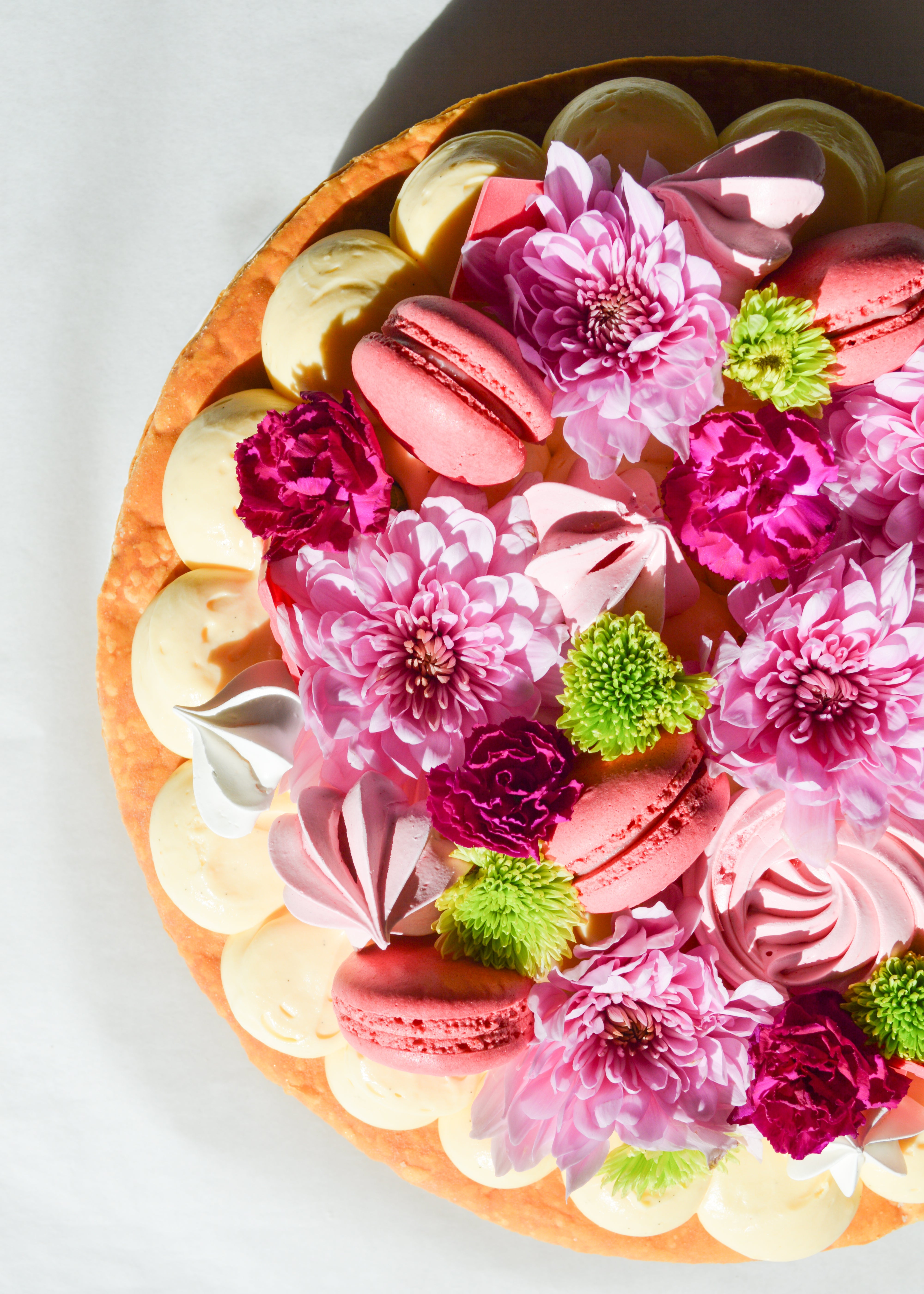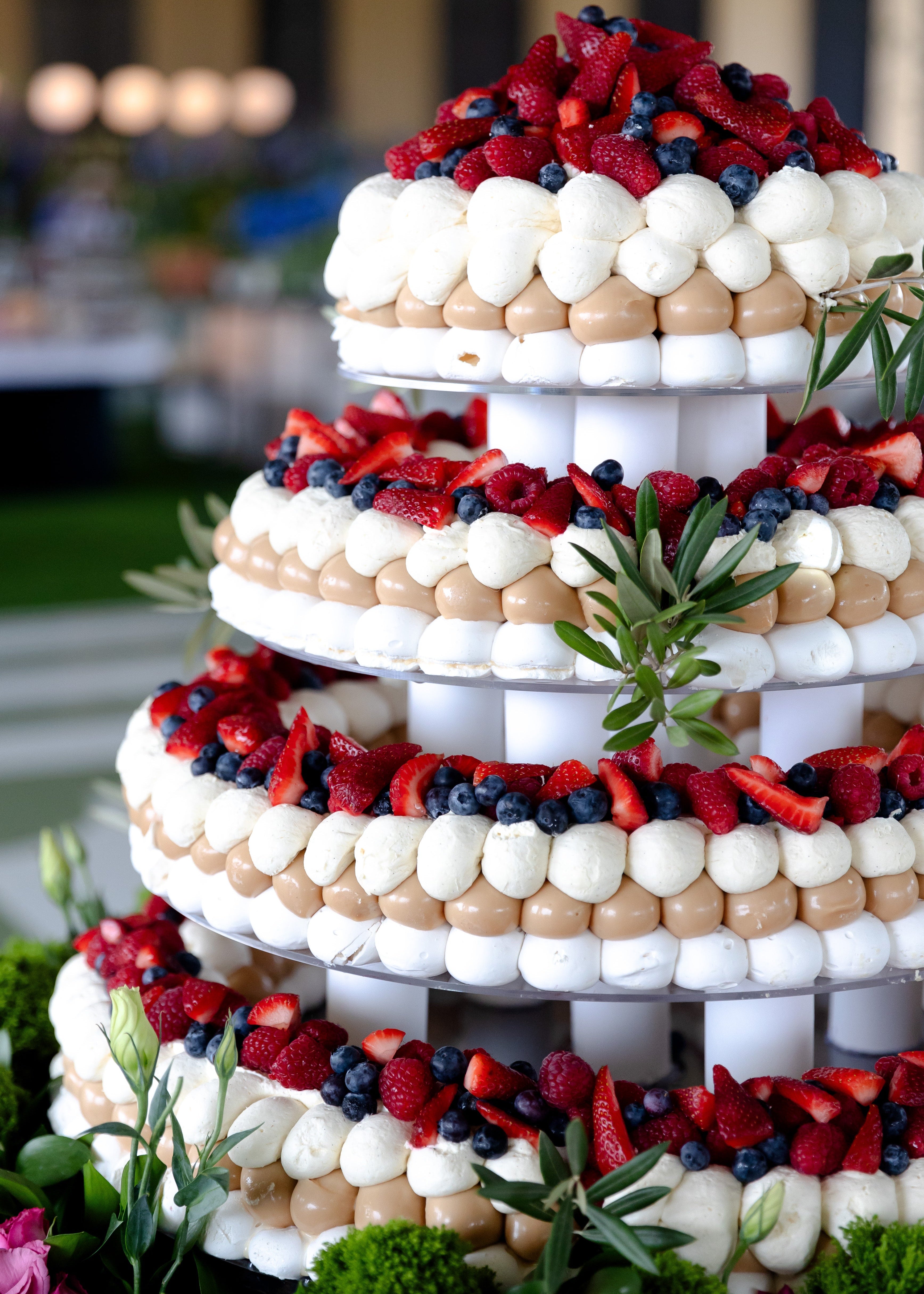 La decoración incuye merenguitos, flores, macarons, frutas frescas, chocolate.