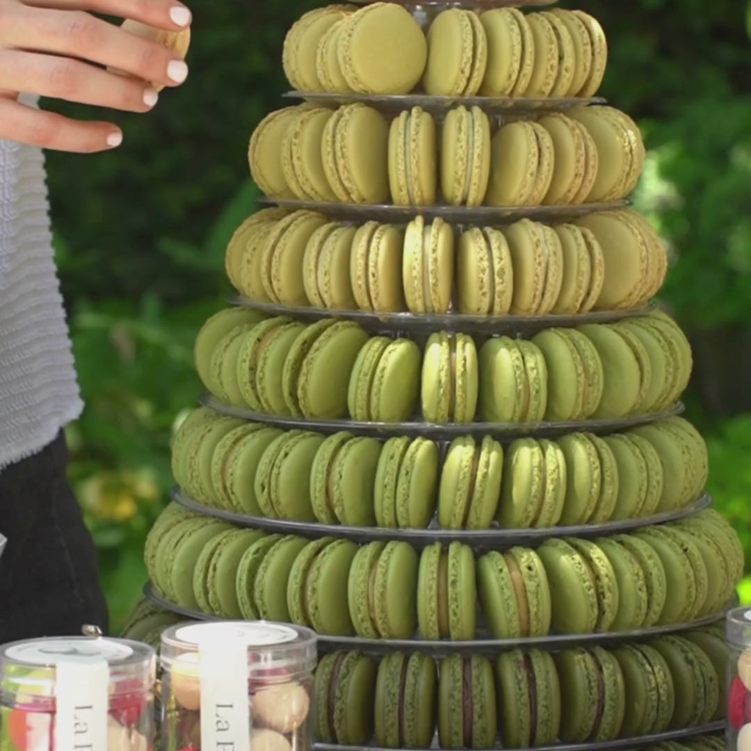 Precioso árbol de macarons, de una tonalidad verde en degrade para simular un bello árbol navideño.